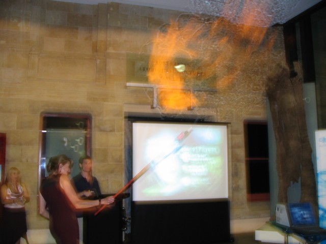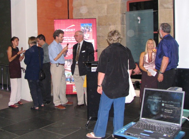the foyer of the South Australian MuseumOn Friday 8th April 2005, 120 invited AIP members, SPACED members, school teachers and government representatives attended the launch of the Einstein International Year of Physics in SA in the foyer of the SA Museum. The picture shows the year starting with a bang, as a hydrogen balloon was detonated by Ms Linda Cooper.