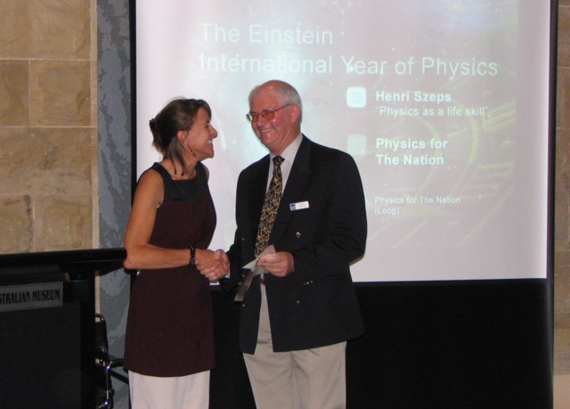 Ms Linda Cooper congratulates Mr Alan Pepper during presentation to him of the Inaugural Physics Teacher of the Year Award