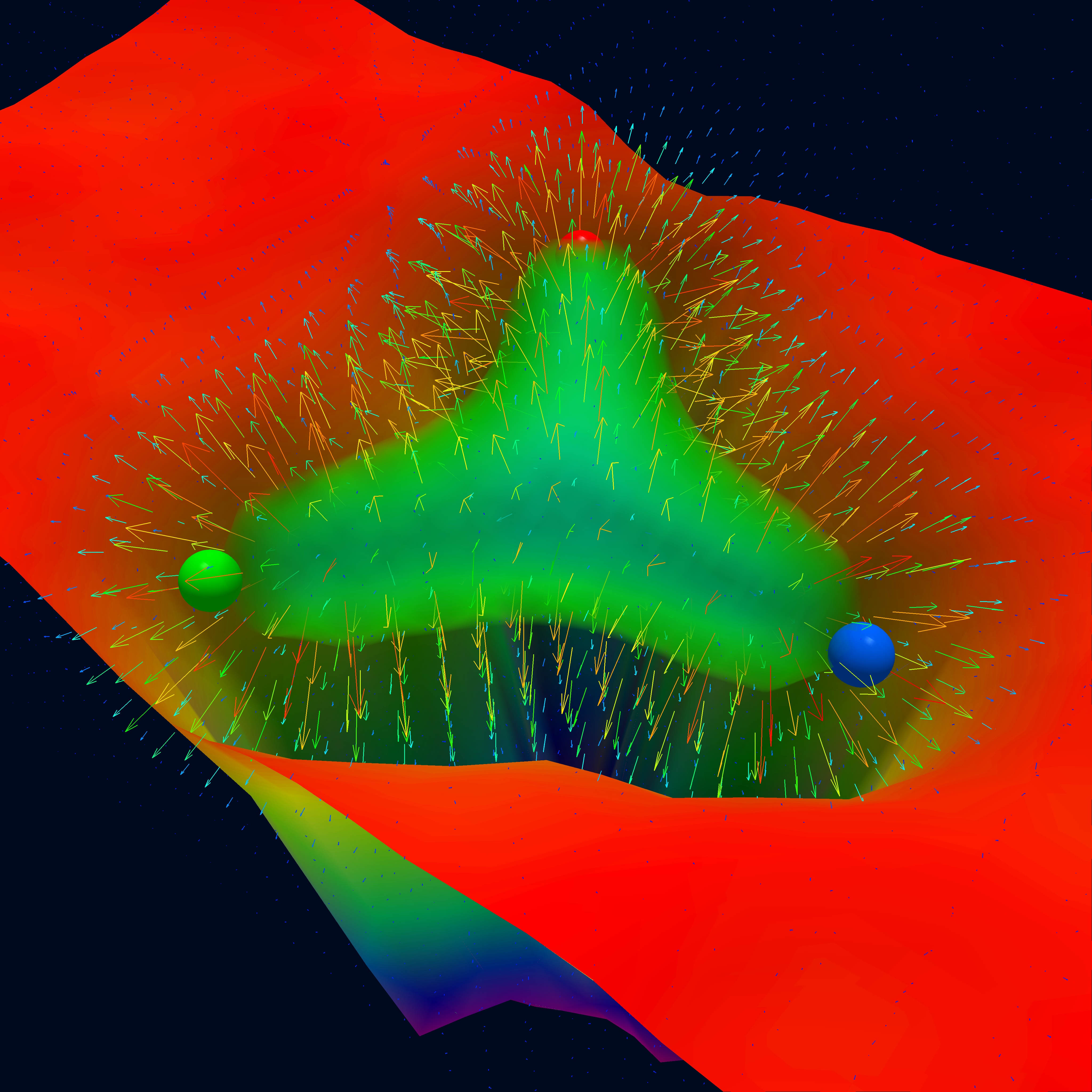 illustrated by the coloured spheres. The surface plot